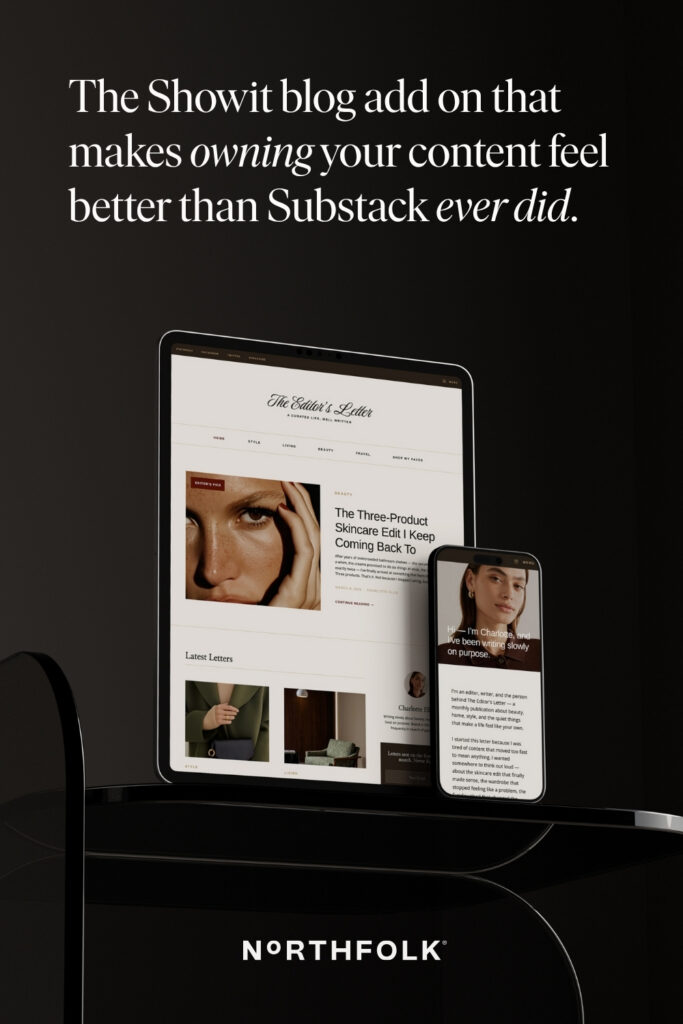 And because we practice what we preach, we built a template that gives you the ✨ clean, editorial, Substack-inspired blog aesthetic ✨ on your very own Showit website. But more on that in a minute.